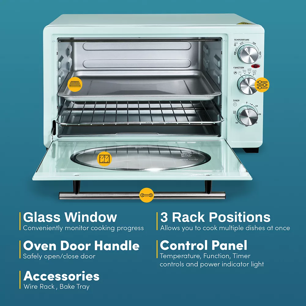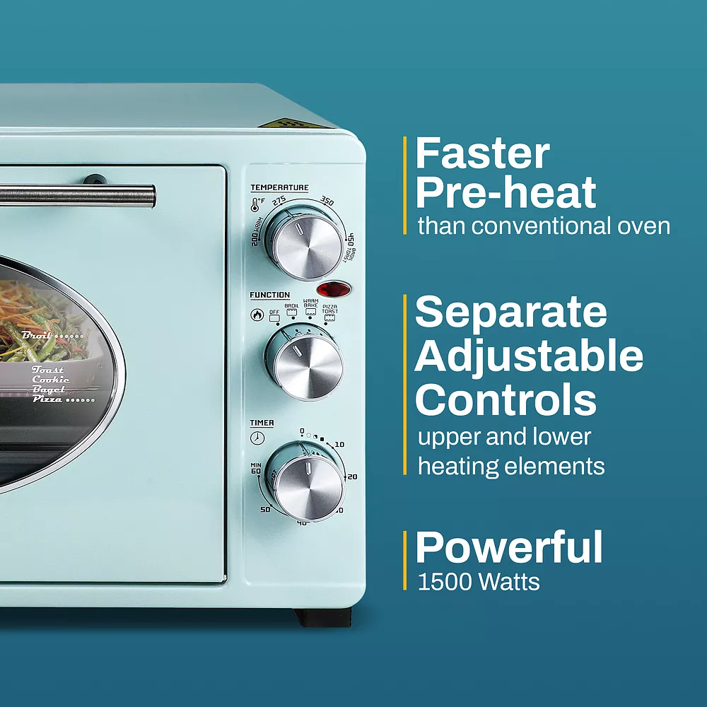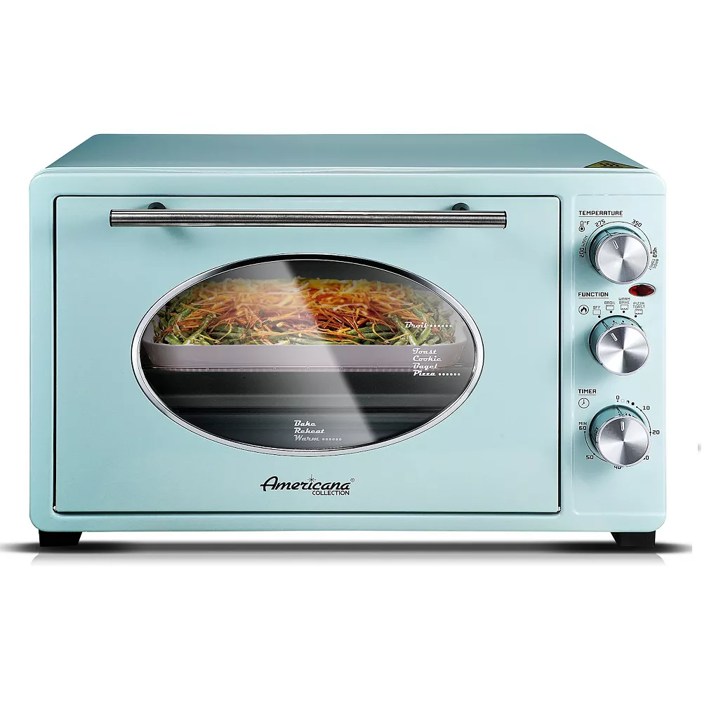 Add a touch of classic nostalgia to your kitchen with the Americana by Elite Vintage 50s Diner Toaster Oven in a retro-style mint finish. The 8-Slice capacity can toast up to four slices of bread or bagels, bake a 12-inch pizza and or broil an open-faced sandwich.