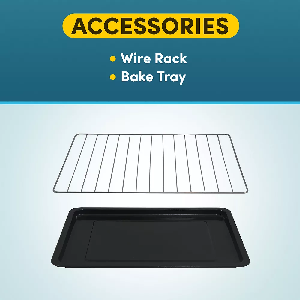 - Enamel-coated bake pan, wire rack, removal tongs & crumb tray