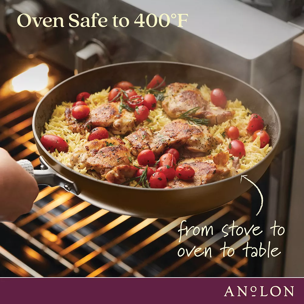 - Anolon SureGrip handles provide a secure hold when moving pots and pans from stove to oven to table