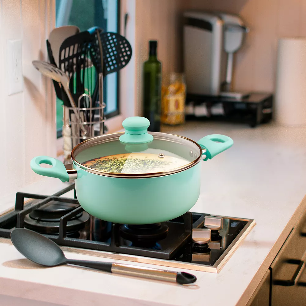 Whip up only the best meals with the Brentwood 7 Piece Nonstick Aluminum Cookware Set in Blue. Food slides right off the cookware set thanks to the exceptional non-stick surfaces. Includes a fry pan, dutch oven with lid, and 2 saucepans with lids. Entirely dishwasher safe fast and easy cleaning.