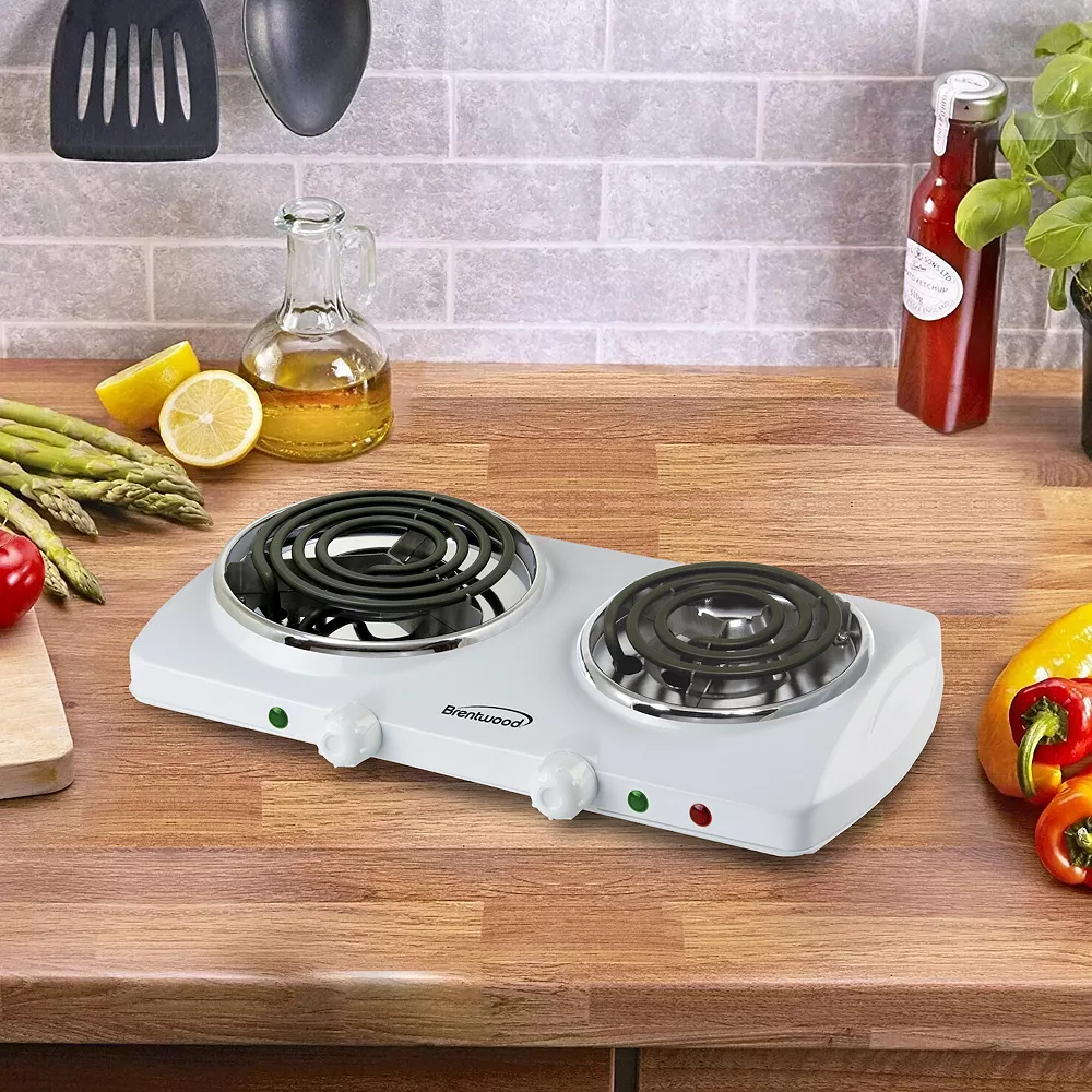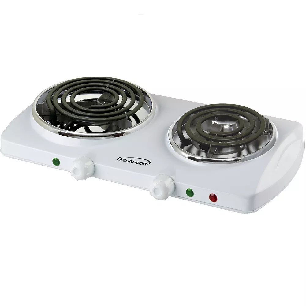 The powerful 1500w Brentwood Double Electric Burner produces adjustable, even heat. Features 1000w and 500w burners with power indicator light. Small and lightweight design takes up little counter space. Easy to clean.