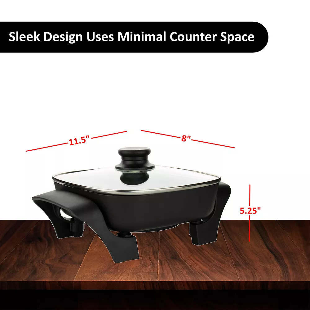 Use the powerful 600 watt Brentwood SK-46 8-Inch Non-Stick Electric Skillet with Glass Lid to fry, grill, roast, stew or bake chicken, steak, bacon, eggs, veggies, scrambles and more. Our skillet has two contoured handles and an adjustable thermostat with power indicator light. We’ve included a tempered glass lid equipped with a steam vent and cool touch handles. Clean up is a breeze with the easy to clean non-stick surface and dishwasher safe tempered glass lid. Skillet seconds as a stylish serving dish with its modern aesthetic.