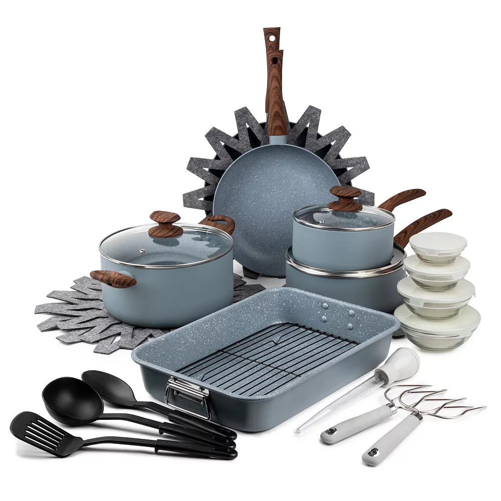 - 5-qt. Dutch oven with glass lid, 3.5-qt. sauce pan with glass lid, 2.5-qt. sauce pan with glass lid, 15.7″ x 11″ roaster w/ interior rack, 12-in. frypan, 10-in. frypan, nylon ladle, spoon and turner, 4 Felt cookware protectors, 4-pc. glass bowl set (4.5-oz., 6.9-oz., 11.5-oz., 15-oz.), 2 lifters & silicone turkey baster