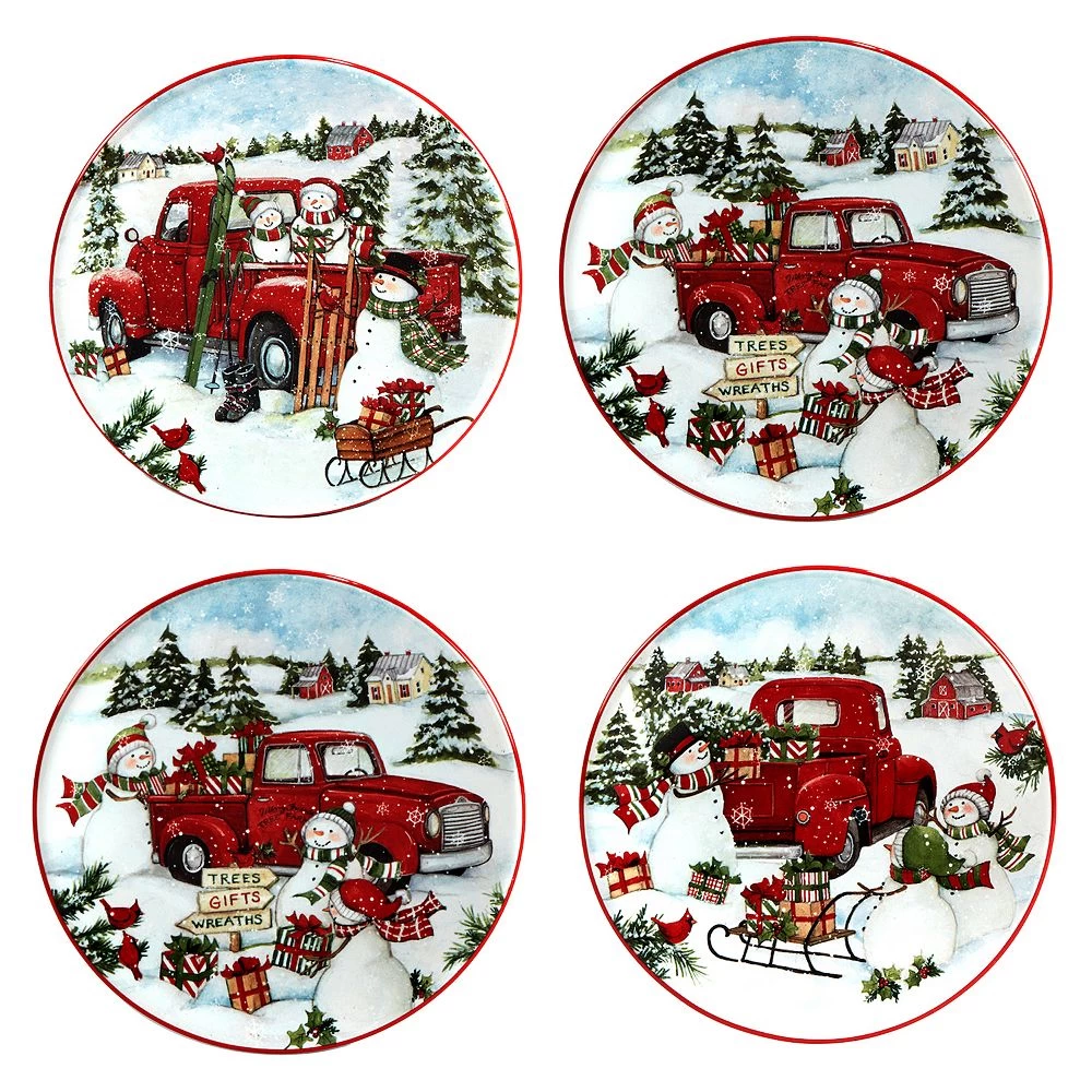 Give your holiday dining decor a festive update with this Certified International Red Truck Snowman four-piece canape plate set.