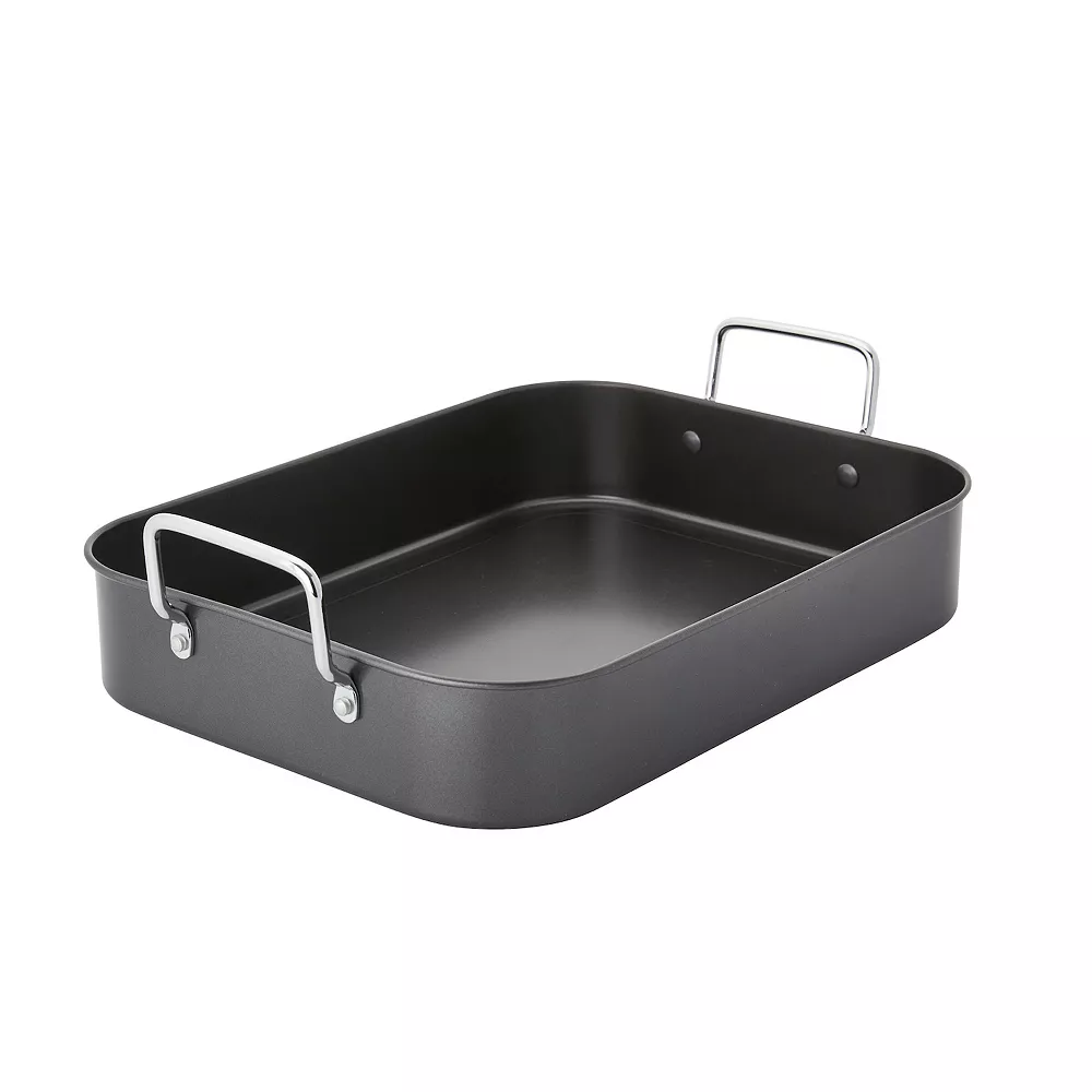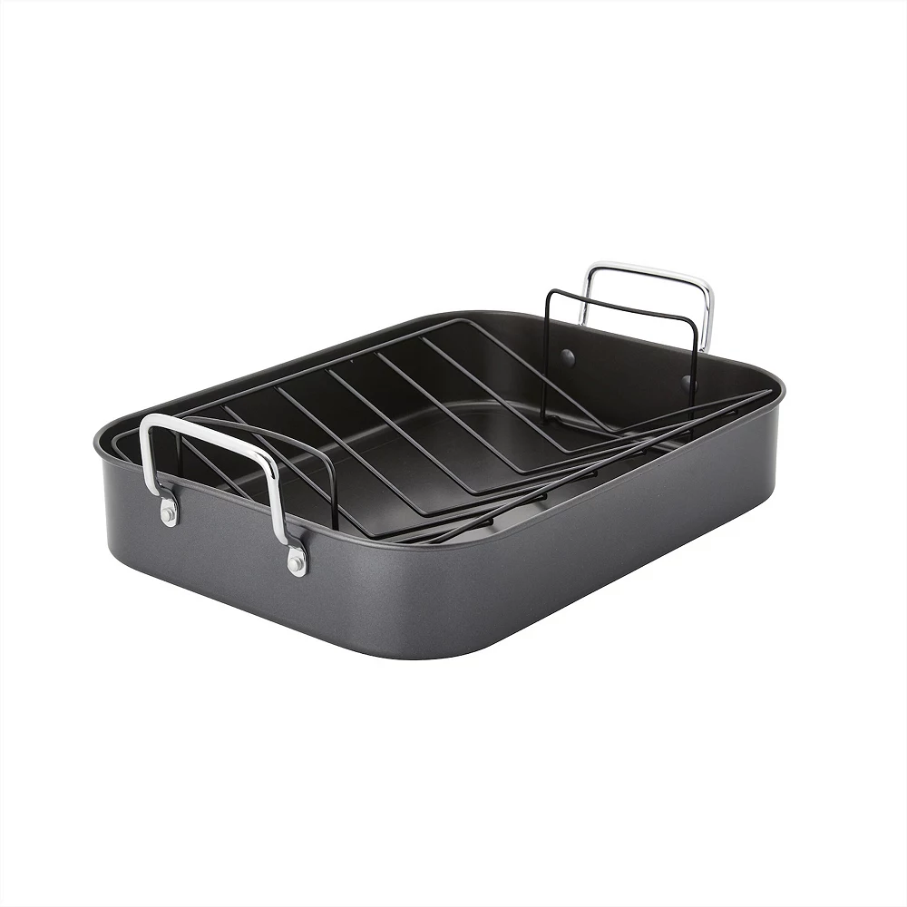 This Chicago Metallic Roaster with Rack is great for roasting turkey, chicken, seafood and so much more. It features a V-shaped rack that evenly distributes heat for consistent roasting and elevates the meat above fat, drippings or vegetables.
