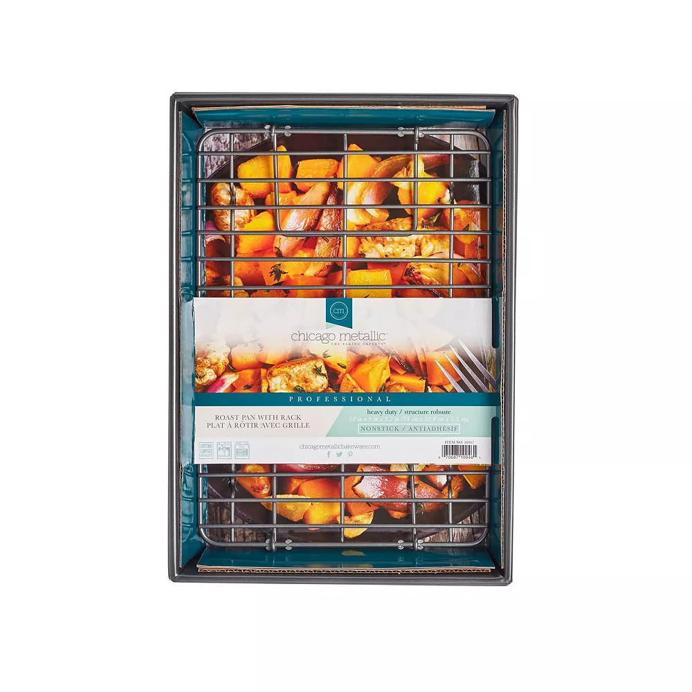 You’ll be ready to take on even the largest meat with this Chicago Metallic roast pan. Large stainless steel handles ensure easy maneuvering of the pan and handles on the included rack make for easy transportation from pan to cutting board.