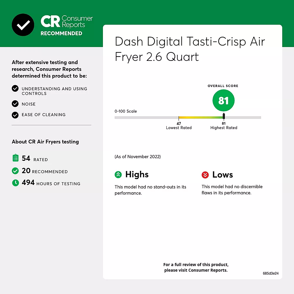 Cook crispy fried food in a dash with the Dash Tasti-Crisp Express Digital Air Fryer. AirCrisp Technology fries with hot air instead of oil, for tasty fried food with up to 75% less fat than a traditional deep fryer.