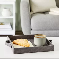 Faux Leather Round Serving Tray With Handles For Coffee Table And Ottoman (Brown, 14.5 X 2 In)
