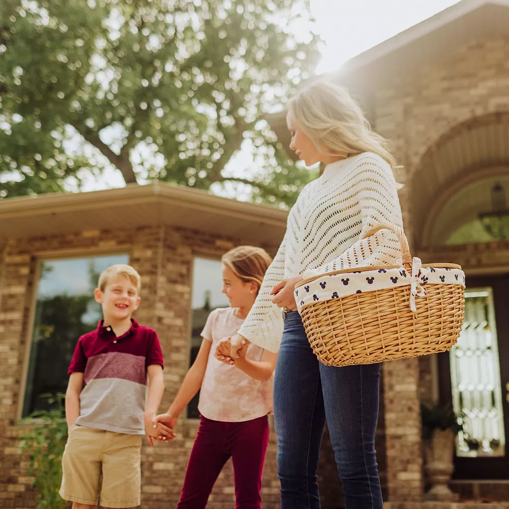 The Mickey Silhouette Country Vintage Picnic Basket with Lid is a classic Disney split-lid large wicker picnic basket set for two.