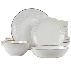 Add a touch of elegance to your dinner table with the Elama Countess 16 Piece Embossed Scalloped Stoneware Dinnerware Set in Ivory. Every dish in this collection is crafted from quality stoneware, decorated with embossed designed and scalloped edges on salad plate, and finished in a glossed glaze. Ideal for everyday and special occasion use. This tableware collection comes with a full service for four and is both dishwasher and microwave safe for easy cleaning and and quick reheating.