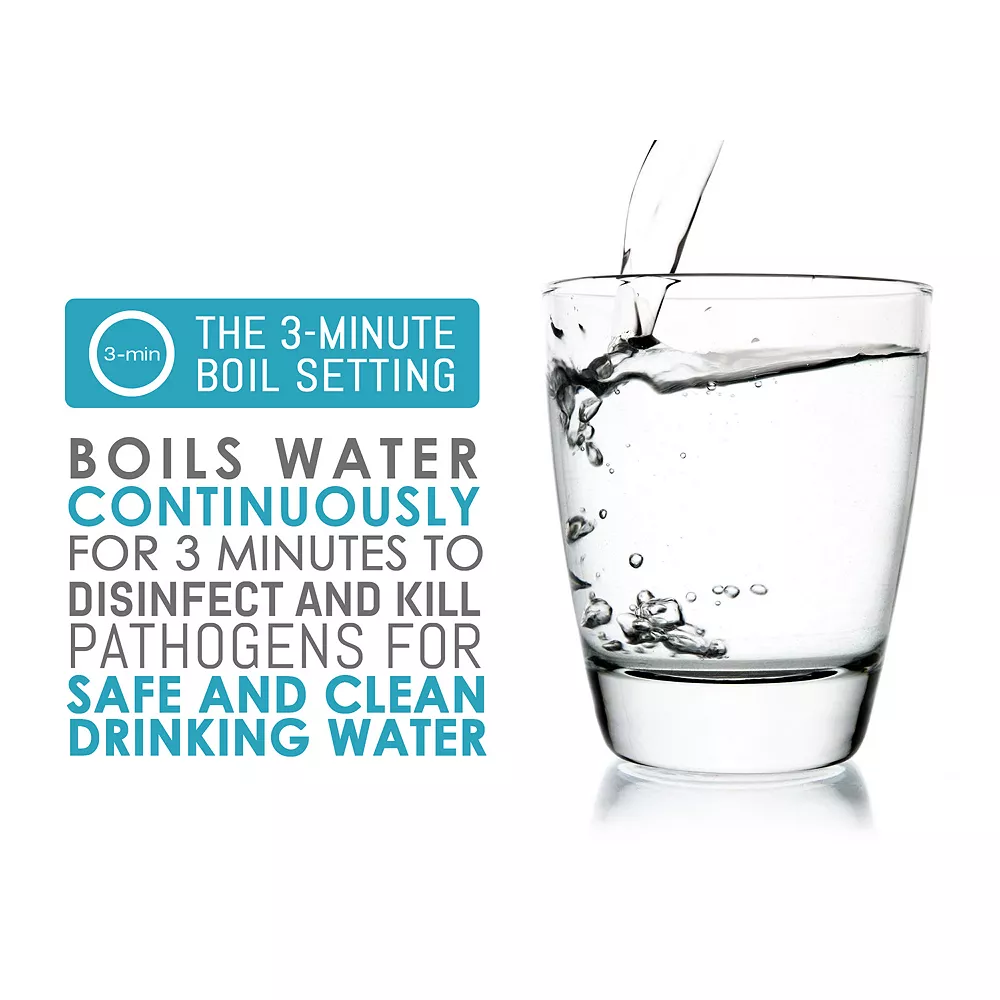 - 3-minute continuous boil setting will sterilize water to kill pathogens making it safe to drink