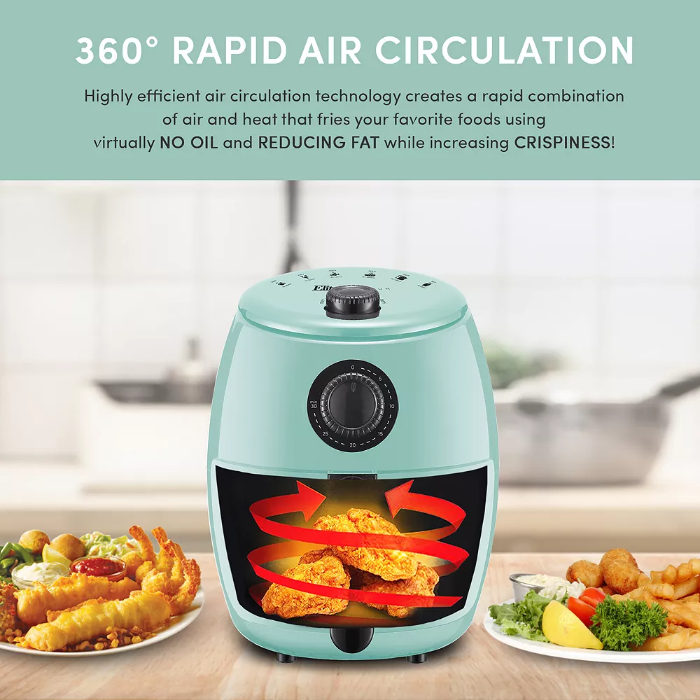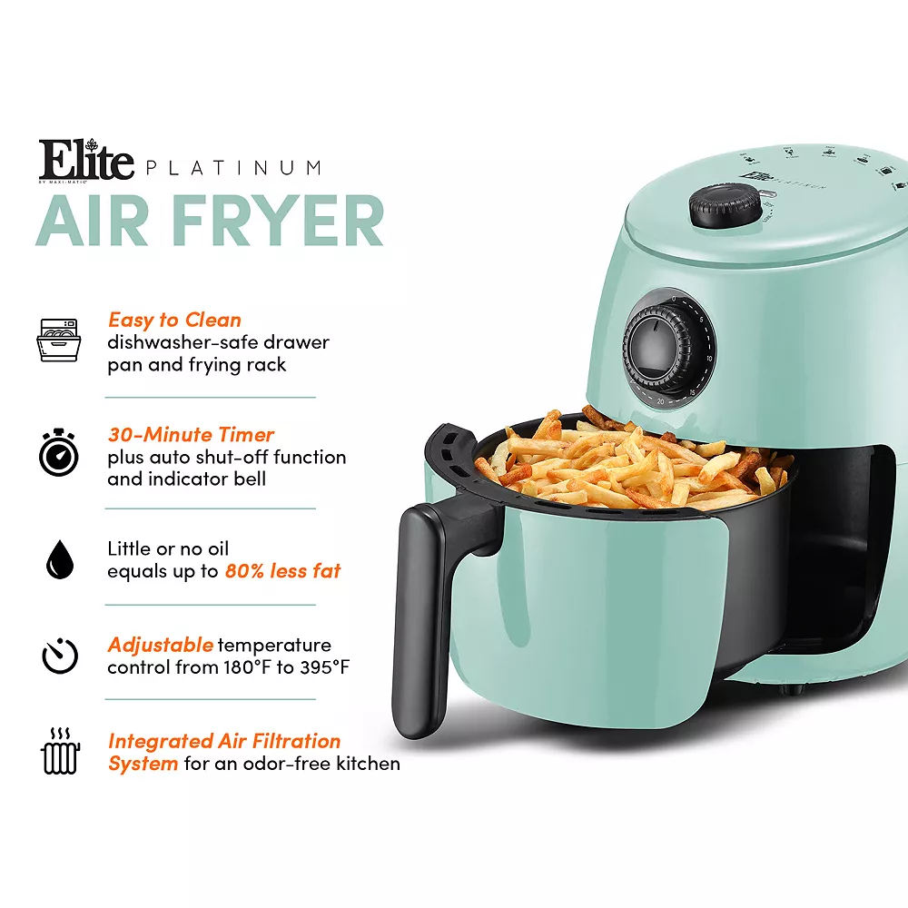 The Elite Platinum Oil-Free Air Fryer has a variety of functions to handle a wide array of cooking tasks. With its easy-to-use timer and temperature control knobs, you can fry, cook, or even bake your favorite meals and snacks with ease!