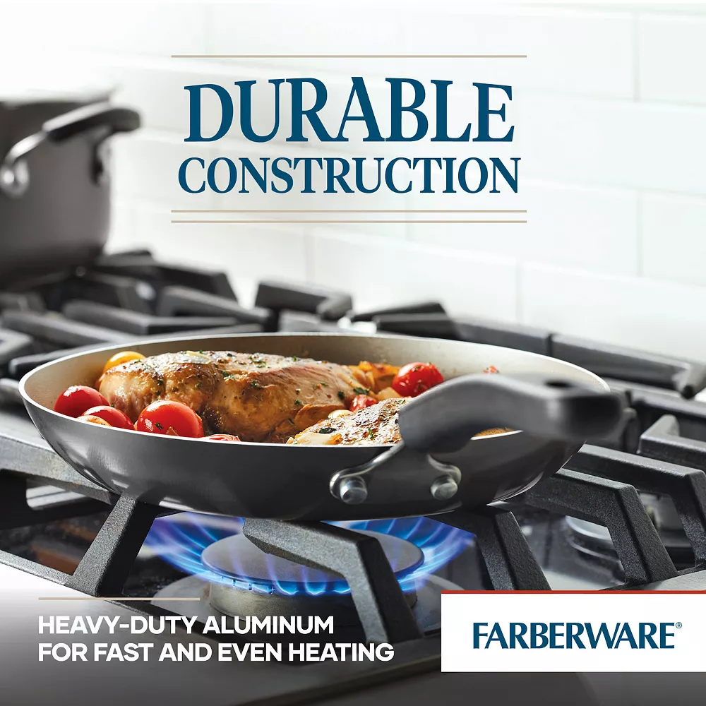Home chefs who log lots of hours in the kitchen will love this Farberware Cookstart DiamondMax cookware. Its heavy-duty aluminum construction ensures excellent heat distribution and durability that lasts recipe after recipe.