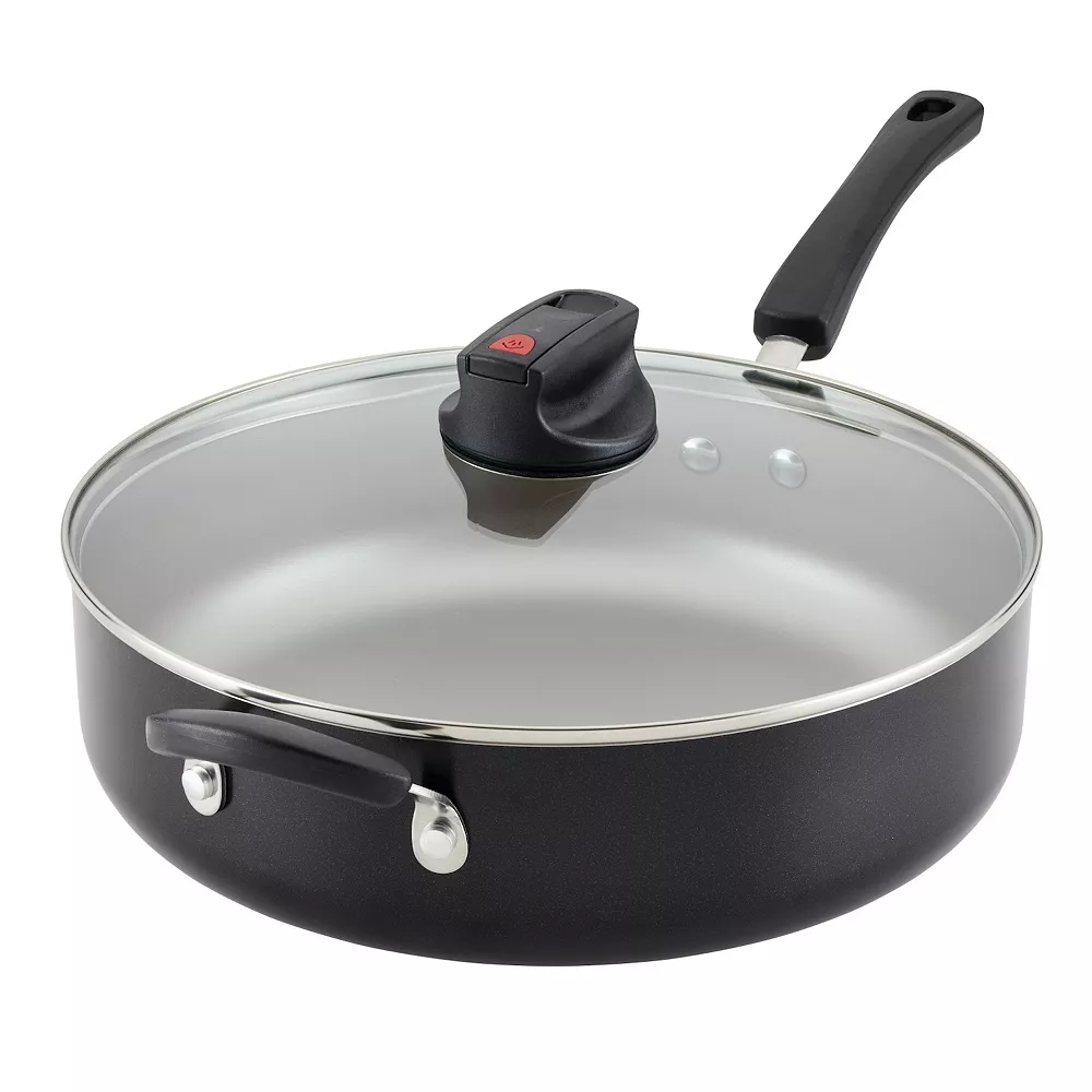 This Farberware Smart Control jumbo cooker features a tempered glass lid with an innovative vent in the knob for easy steam release and fewer boil-overs.