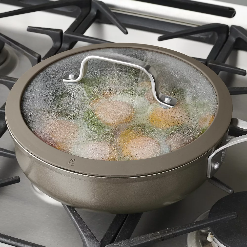 - Silicone-rimmed tempered glass lids allow you to monitor your food during the cooking process