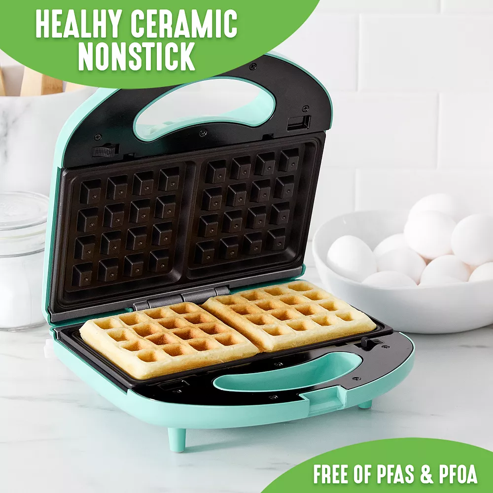 - Quick-heating design means it’s easy to make toasted sandwiches and classic waffles in no time
