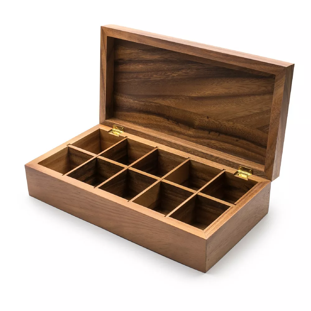 An elegant addition to your kitchen. This simple, yet sophisticated tea chest features a durable acacia wood construction — wonderful because each piece of wood has a slightly different, spectacular characteristic for a unique appearance. And its environmentally-friendly design also resists water and staining, so you get a storage piece that will last for years to come. With 10 different compartments, so you can conveniently store all your favorite teas, from Earl Grey to classic chamomile. Plus, a hinged top for easy closure. A great gift idea for the tea-lover!