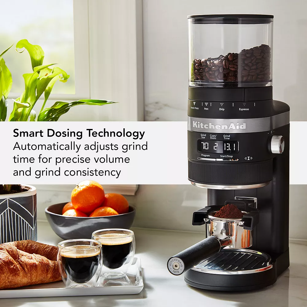 Designed for your perfect grind, every time. This KitchenAid® Burr Coffee Grinder achieves consistent grind sizes for all brew methods from French Press to Espresso and so much more, with 70 precise settings. The Automatic Smart Dosing Technology takes the guesswork out of dosing and automatically adjusts grind time to deliver the proper volume and consistency, and its compact design fits under most kitchen cabinets, so it’s easy to access and great for everyday use.