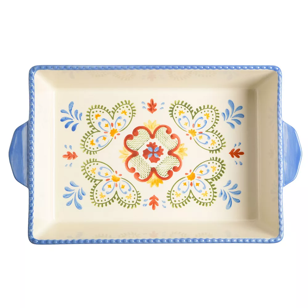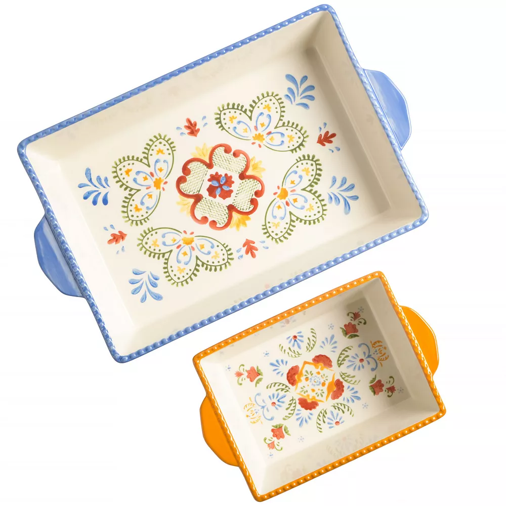 The 2 piece Tierra collection bakeware set by Laurie Gates will add a light touch of color and style to your kitchen. This set comes with one small rectangular baking dish and one large rectangular baking dish, each with unique hand painted designs. Constructed with durable stoneware, these bakers will stand the test of time, all while adding a subtle but colorful floral accent to your home. These bakers are dishwasher, microwave, and oven safe for easy reheat and convenient clean up. Make your bakes more beautiful with this Tierra collection bakeware set!