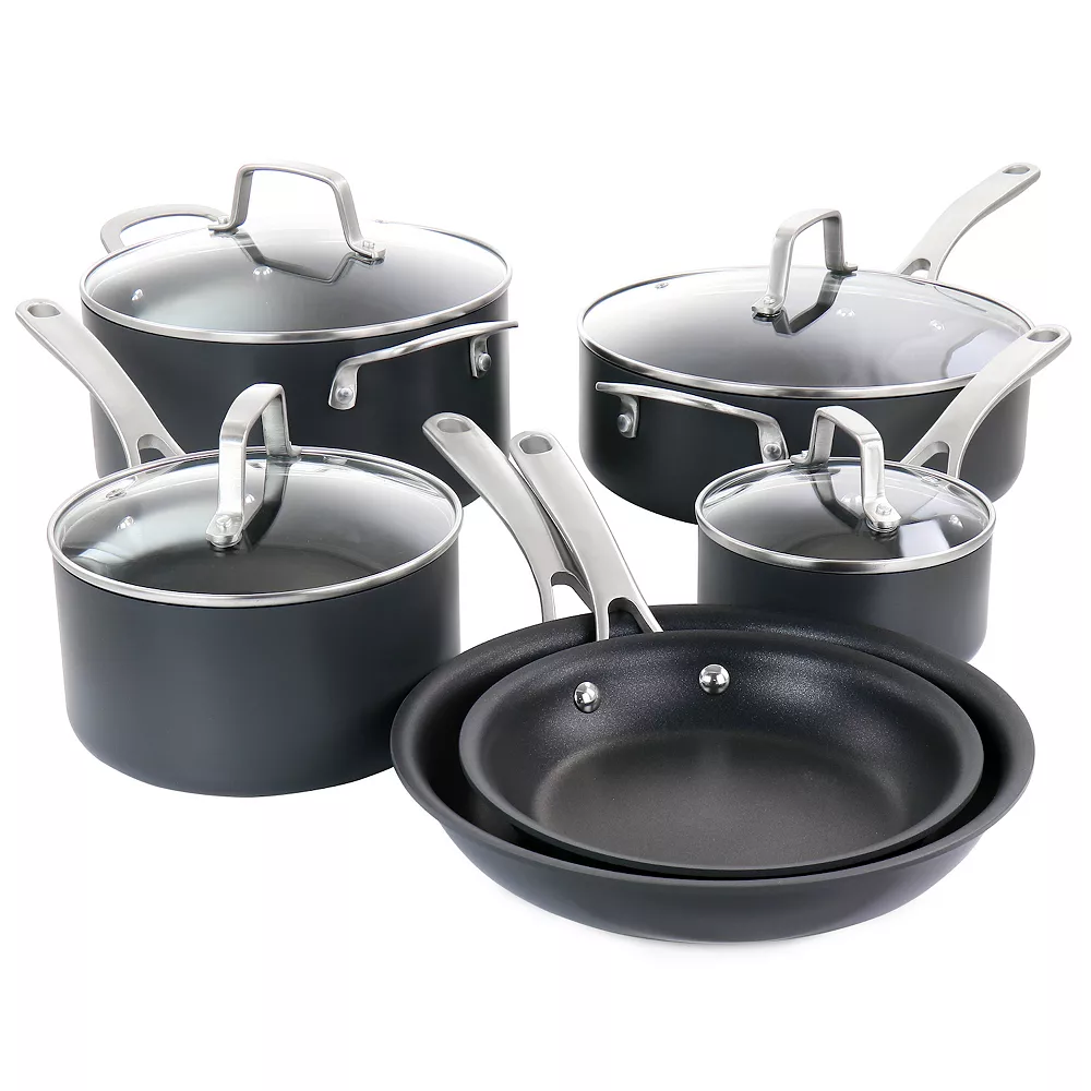 Suit up the kitchen work area with the Martha Stewart 10 Piece Nonstick Hard Aluminum Cookware Set in Matte Black. The nonstick coating allows for more forgiving cooking and provides a fast cleanup. Its aluminum body evenly distributes heat and is oven safe up to 480F. For long lasting quality its recommended to hand wash the cookware. Create the perfect pasta dish, simmer beautiful bechamel sauce, or make a savory steak for dinner tonight.