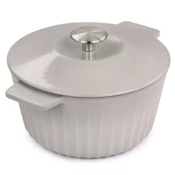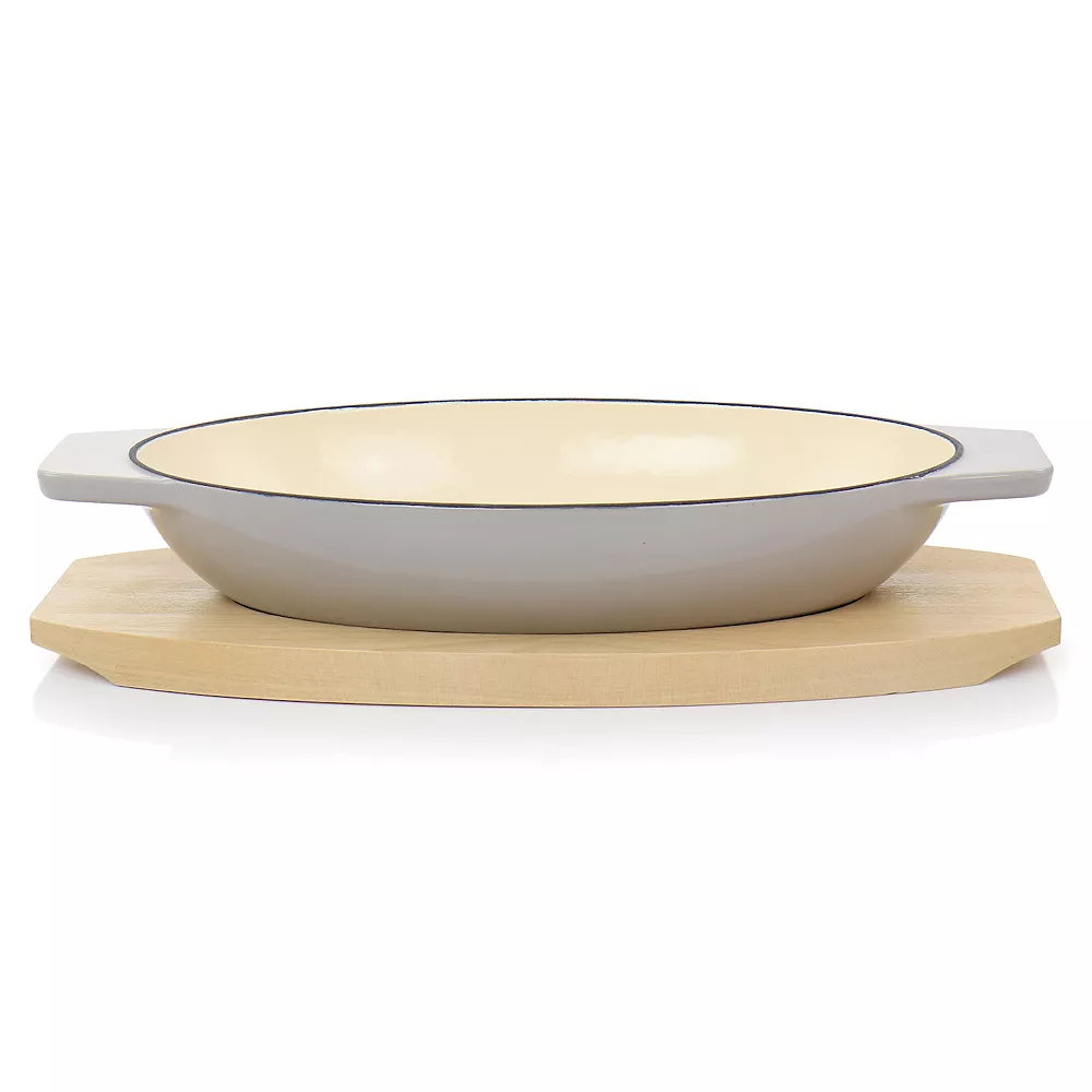 Bring hot meals fresh from the oven to the table with the Martha Stewart 2 Piece Enameled Cast Iron Oval Casserole Birch Wood Trivet Set in Taupe. This serving set includes an oven safe oval casserole with a Birch wood base for perfect presentation. Regardless of how hot the enamel cast iron piece is, the wood base protects table and counter spaces from the heat. Set is not dishwasher safe, hand wash the cast iron casserole and wipe the wood trivet with a damp towel. Cook a variety of meals such as oven baked mac ‘n’ cheese, carne fajitas, or Bibimbap.