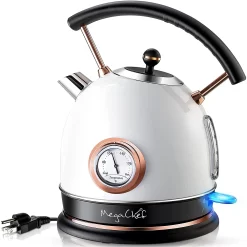With a sleek retro styling, this MegaChef 1.8-Liter Electric Tea Kettle is sure to make a statement in any kitchen.