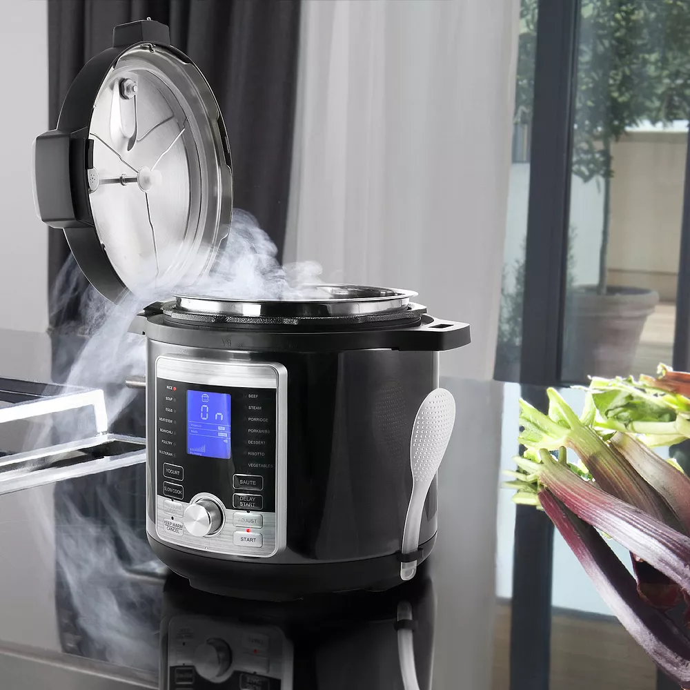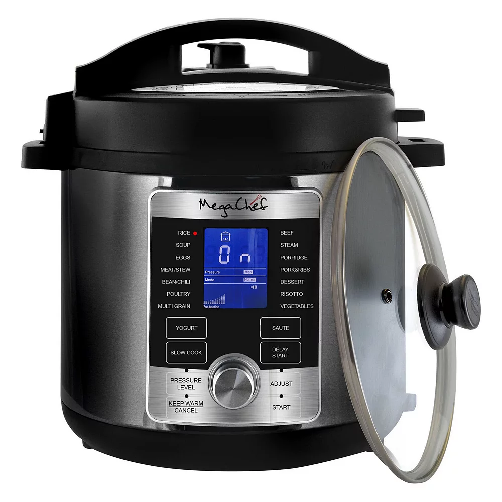 - 6-qt. pressure cooker, removable stainless steel cooking pot, tempered glass lid, detachable drip tray & plastic serving spoon
