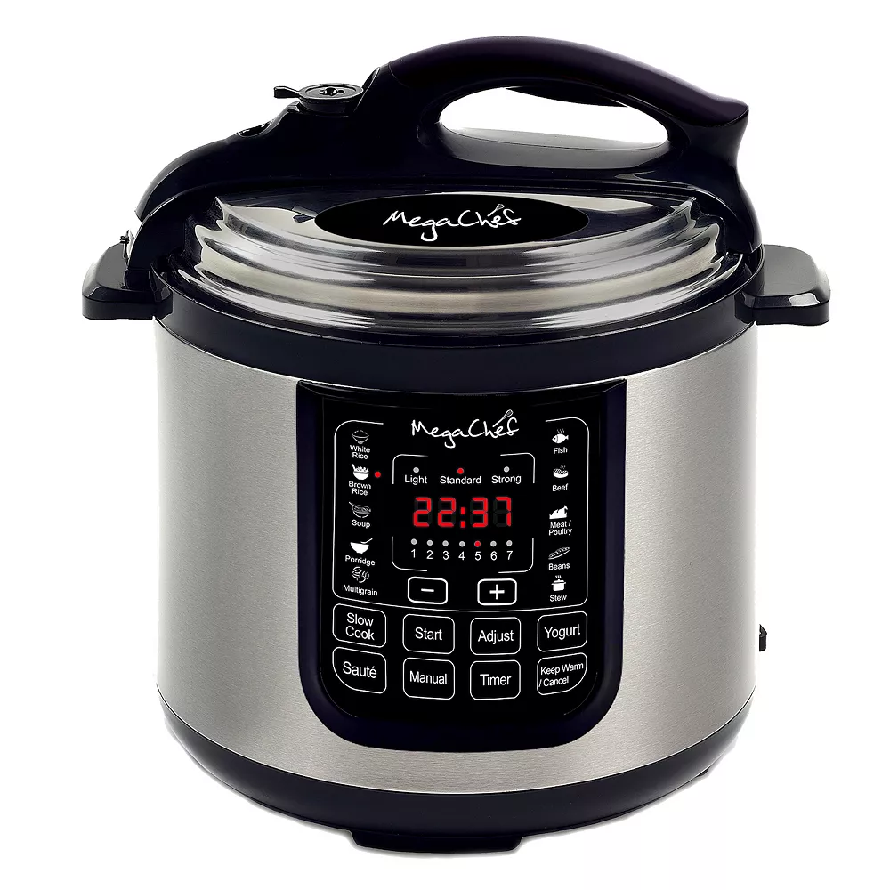 A simple, easy-to-use design, convenience and technology come together in this MegaChef dual burner cooktop buffet range.