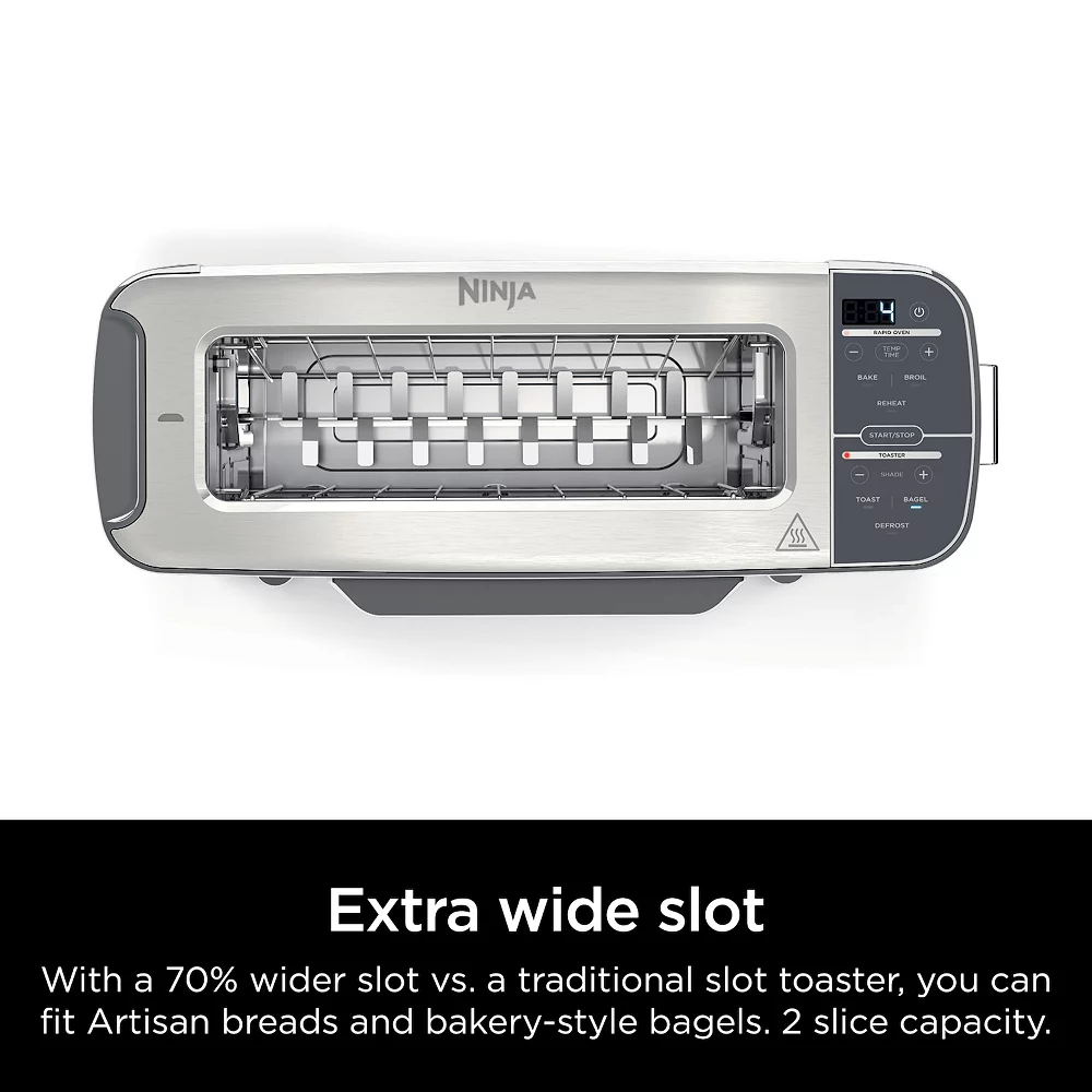 Meet the Ninja Foodi Flip Toaster, the flip toaster that bakes and broils. This 2-in-1 toaster and compact oven allows you to evenly toast 2 slices of thick-cut bread in toaster mode and quickly cook snacks in oven mode.