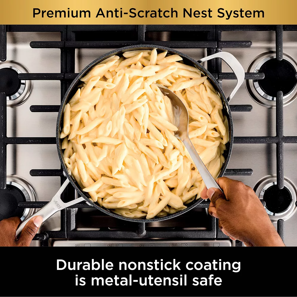 Ninja Foodi Neverstick Premium Anti-Scratch Nest System is the nesting cookware that won’t stick, chip, or flake. Its unique nesting design saves space and protects the cooking surfaces of your pots and pans during storage.