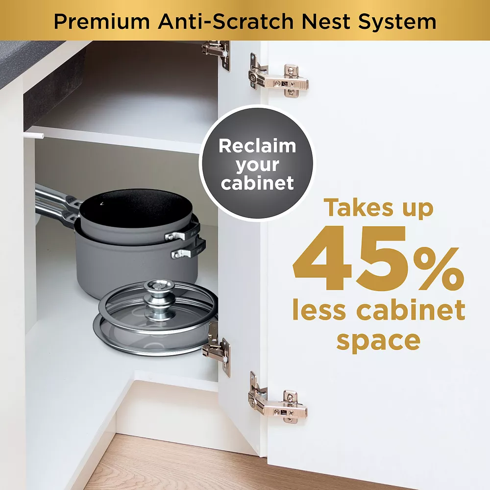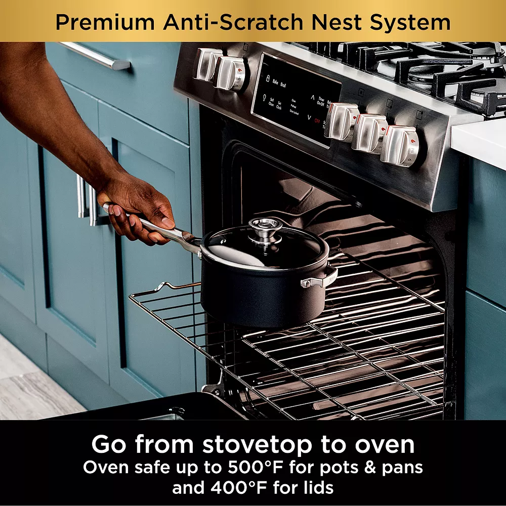 - During storage, the unique anti-scratch nesting design protects your pots and pans by suspending the cooking surfaces so they never touch. Handles and nonstick coating are both oven safe up to 500ยฐF. Lid is oven safe up to 400ยฐF.