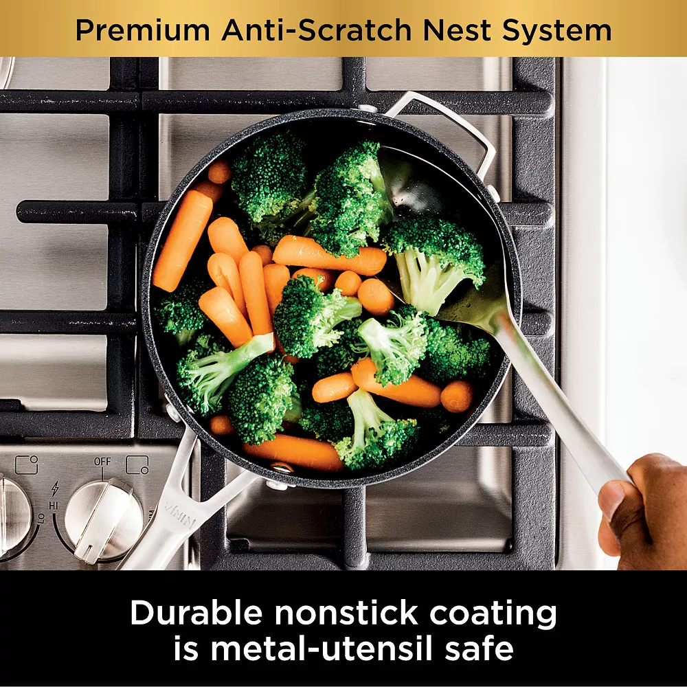 Ninja Foodi Neverstick Premium Anti-Scratch Nest System is the nesting cookware that won’t stick, chip, or flake. Its unique nesting design saves space and protects the cooking surfaces of your pots and pans during storage.