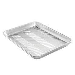 This embossed natural aluminum bakeware from Nordic Ware features an exclusive prism grid that adds durability and provides easy release while also improving air flow for uniform crisping.