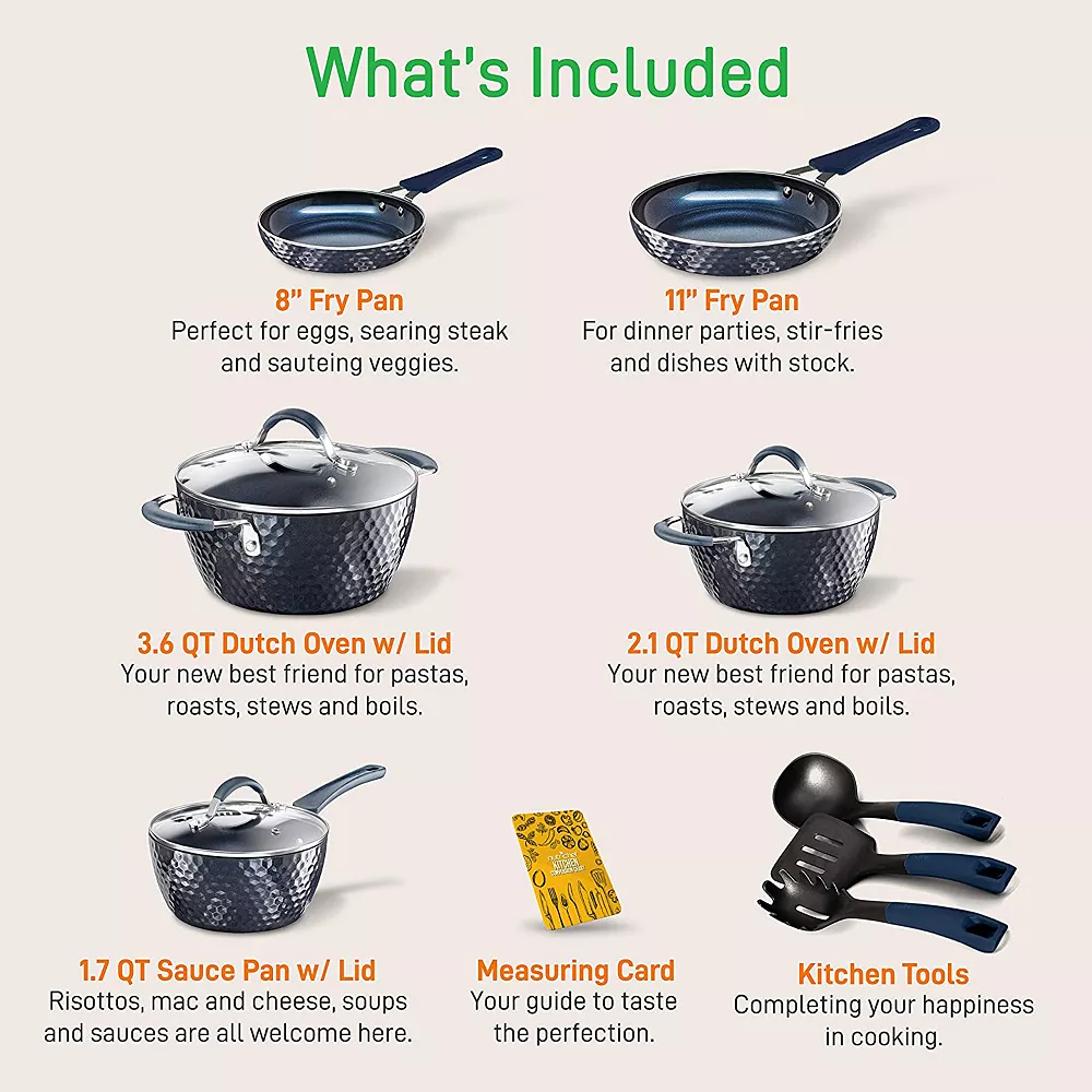 - Includes 1.7-quart saucepan pot with lid, 3.6-quart Dutch oven pot with lid, 2.1-quart cooking pot with lid, 11-inch large fry pan, 8-inch small fry pan, soup ladle, pasta fork, and spatula