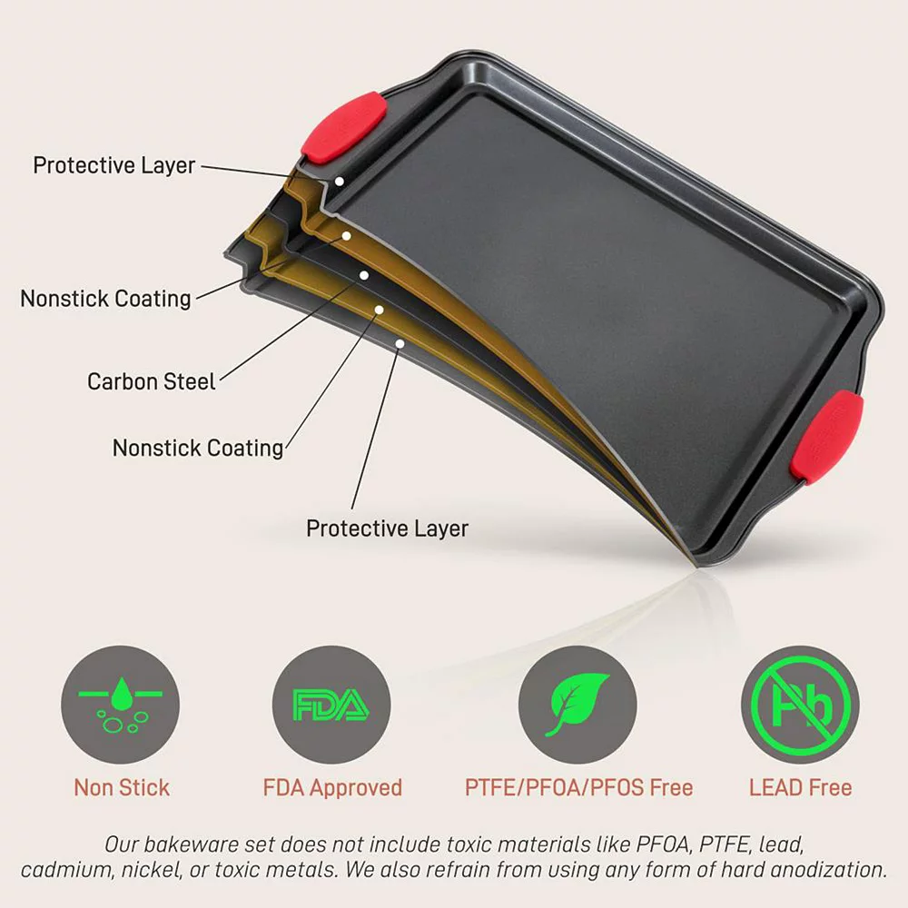 Get ready for your own great bake-off with the NutriChef 3 Piece Carbon Steel Bakeware Set. Each piece is constructed of carbon steel and covered in an eco-friendly non-stick coating. Heat-resistant silicone inserts on the handles make the journey from oven to table safe and easy.
