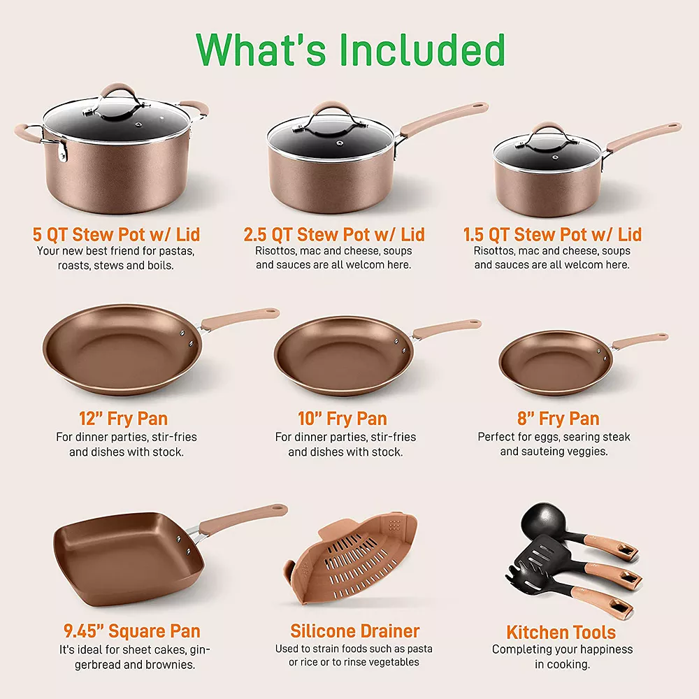 - Includes (6) bakeware set, (3) nylon utensils, (1) silicone drainer, (3) open fry pans, 1.5-quart saucepot with lid, 2.5-quart sauce pot with lid, 5-quart stew pot with lid, grill pan, soup ladle, pasta fork, spatula