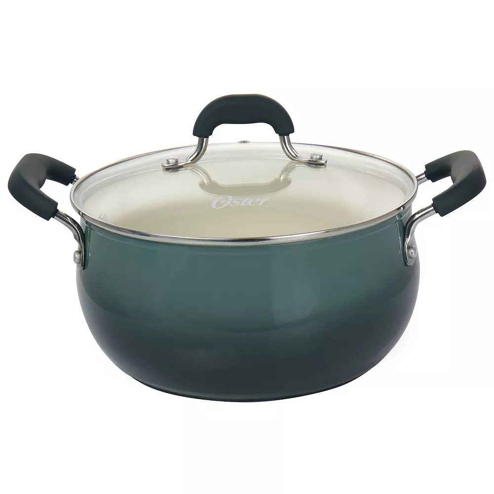 Liven up the kitchen space with the Oster Cocina Corbett 5.4 Quart Nonstick Aluminum Dutch Oven in Gray. This charming belly shaped cooking pot allows for well distributed heating while providing a large carrying capacity. Soft grip handles stay cool to the touch as they give you a comfortable hold. Cut down on oils and fats, thanks to the ceramic nonstick interior. For long lasting care, hand wash the cookware and avoid using abrasive tools. Create soups, curries, stews or any other warm comforts for the family to enjoy.