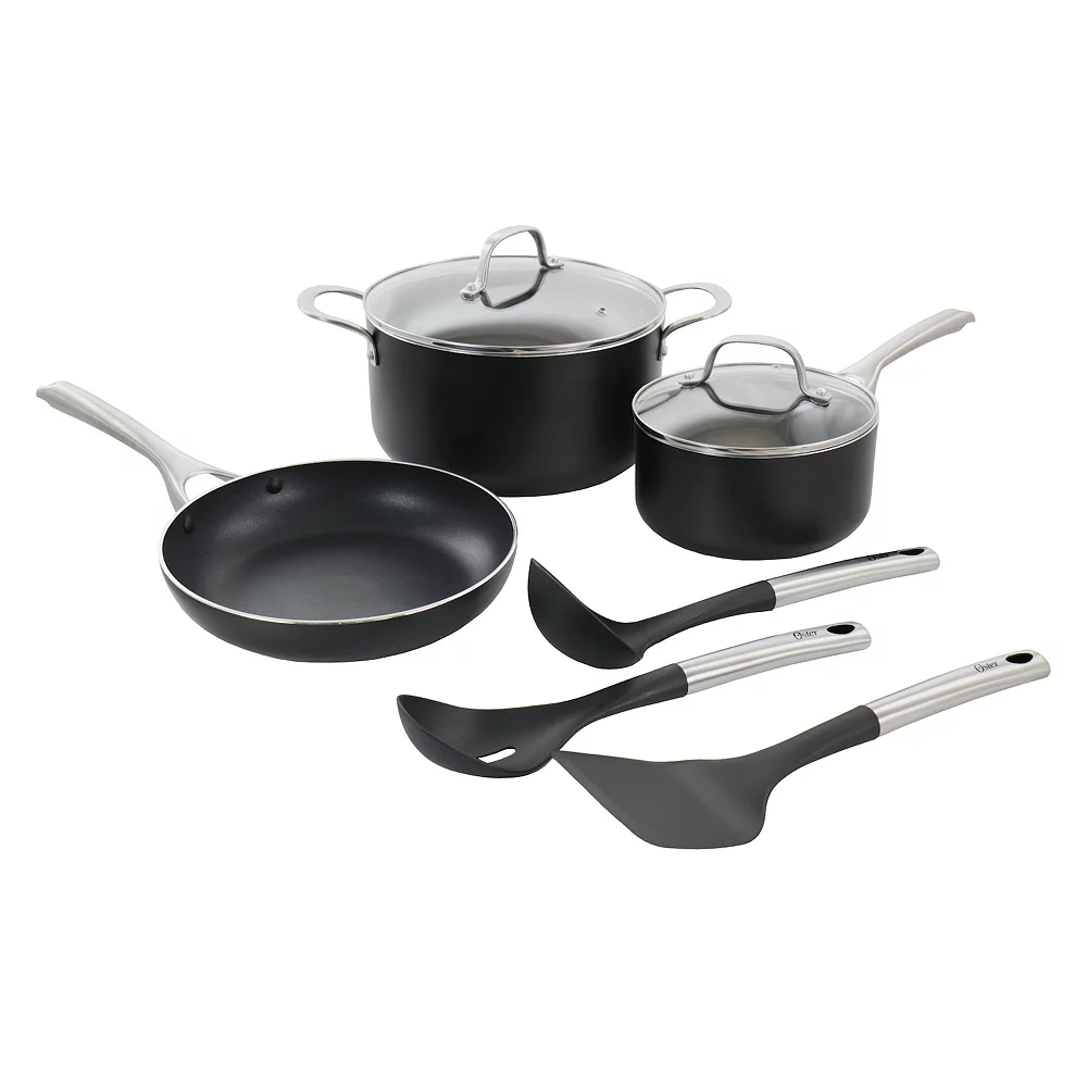 Complete your cookware collection with the Oster Cocina Palladium 8 Piece Aluminum Cookware Set in Black. This full set offers you all the tool you need from One 6Qt. Dutch Oven, One 6Qt. Dutch Oven Lid, One 2.5Qt. Saucepan, One 2.5Qt. Saucepan Lid, One 9.5 Frying Pan, One Ladle, One Turner, and One Slotted Spoon. This collection is crafted from heavy gauge aluminum for strength and durability. The stove top items are also equipped with an induction ready base and are also compatible with Gas, Halogen, Electric, and Vitroceramic. This set also comes with paired, vented tempered glass lids for monitoring your cooking process. The utensil’s double-riveted stainless steel handles will keep cool while you prepare your meals. Components of this collection are dishwasher safe to allow for easy cleaning and everyday use.