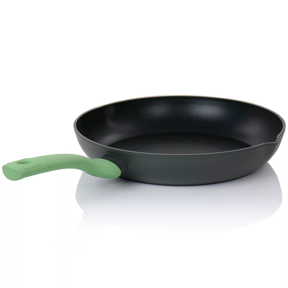 The Oster Cocina Rigby 12 Inch Aluminum Nonstick Frying Pan in Green with Pouring Spouts lets your inner chef run wild. Its nonstick surface gives leeway for creative dishes while cutting back on oils and fats. The soft touch handle stays cool to the touch for safe and easy handling. Stew the perfect sauce and take advantage of the pour spouts for effortless sauce transfer. This pan is made from heavy gauged aluminum for even heating and long lasting durability. Create an array of meals from savory steaks to mouth watering seasoned veggies. Item Dimensions: 19.25 x 12.50 x 2.25 Item Weight: 2.25lbs