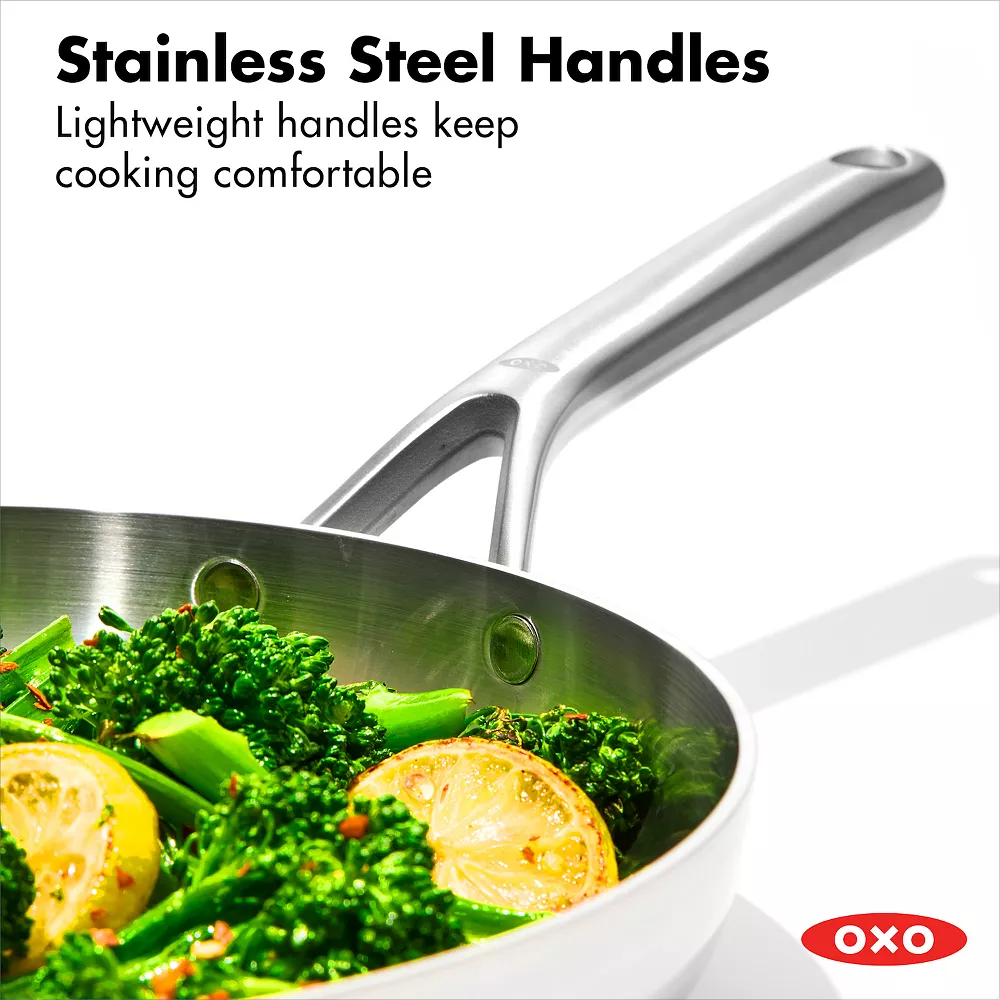 Designed with two stainless steel layers and a heat-radiant aluminum core to deliver fast and even cooking, this OXO Mira 3-Ply stainless steel frying pan is perfect for all stovetops, including induction, and can move directly from the stovetop to the oven or the broiler.