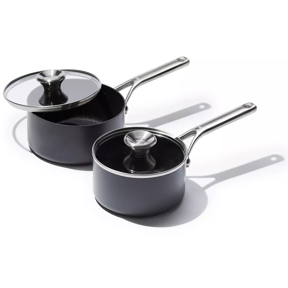 Featuring a heavy-duty induction base that works on every stovetop, This OXO Professional Ceramic Non-Stick saucepan set was designed with a diamond-reinforced ceramic non-stick coating that delivers effortless food release with less oil.