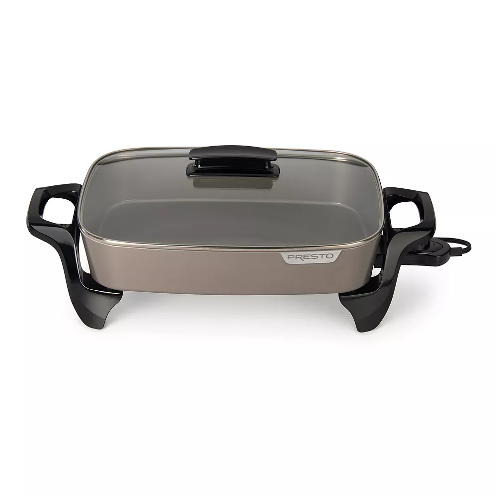 Roast, fry, grill, stew, bake, and make casseroles in this versatile Presto electric skillet. With a ceramic nonstick surface inside and out, you’ll always enjoy stick-free cooking and easy cleaning.