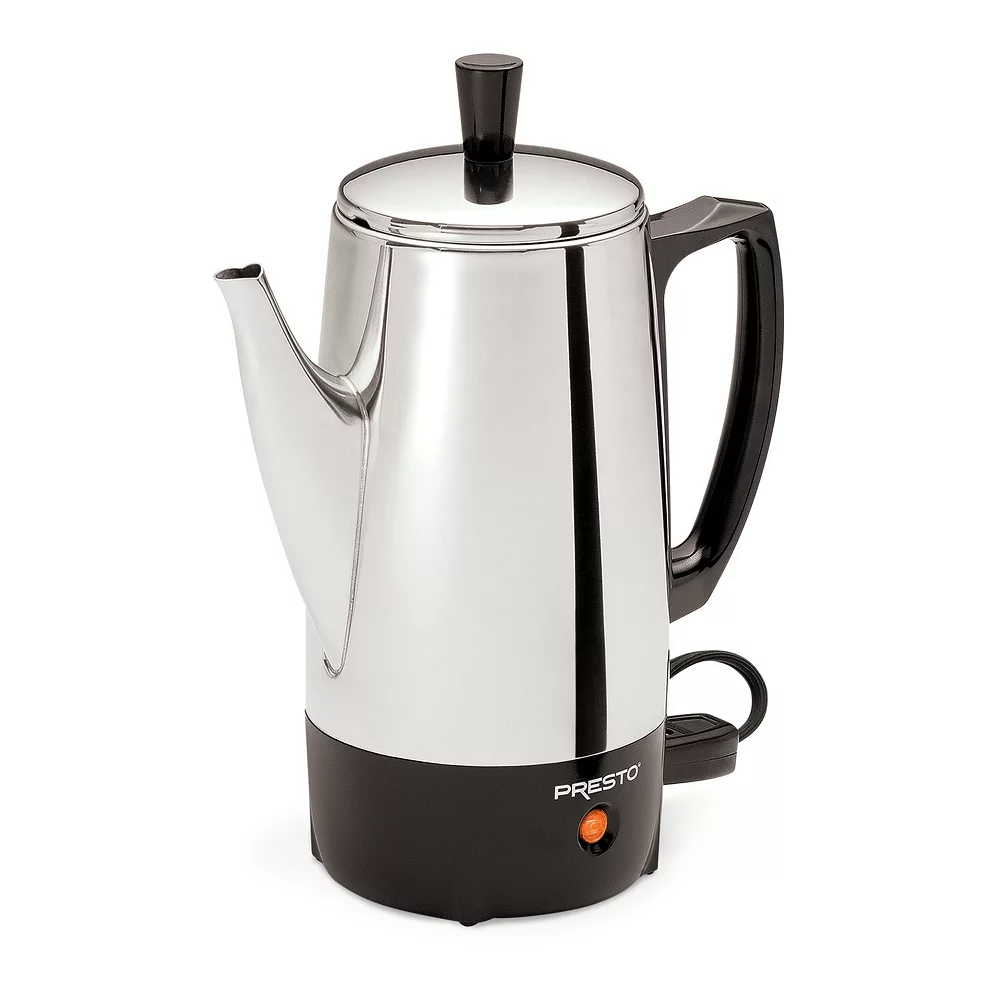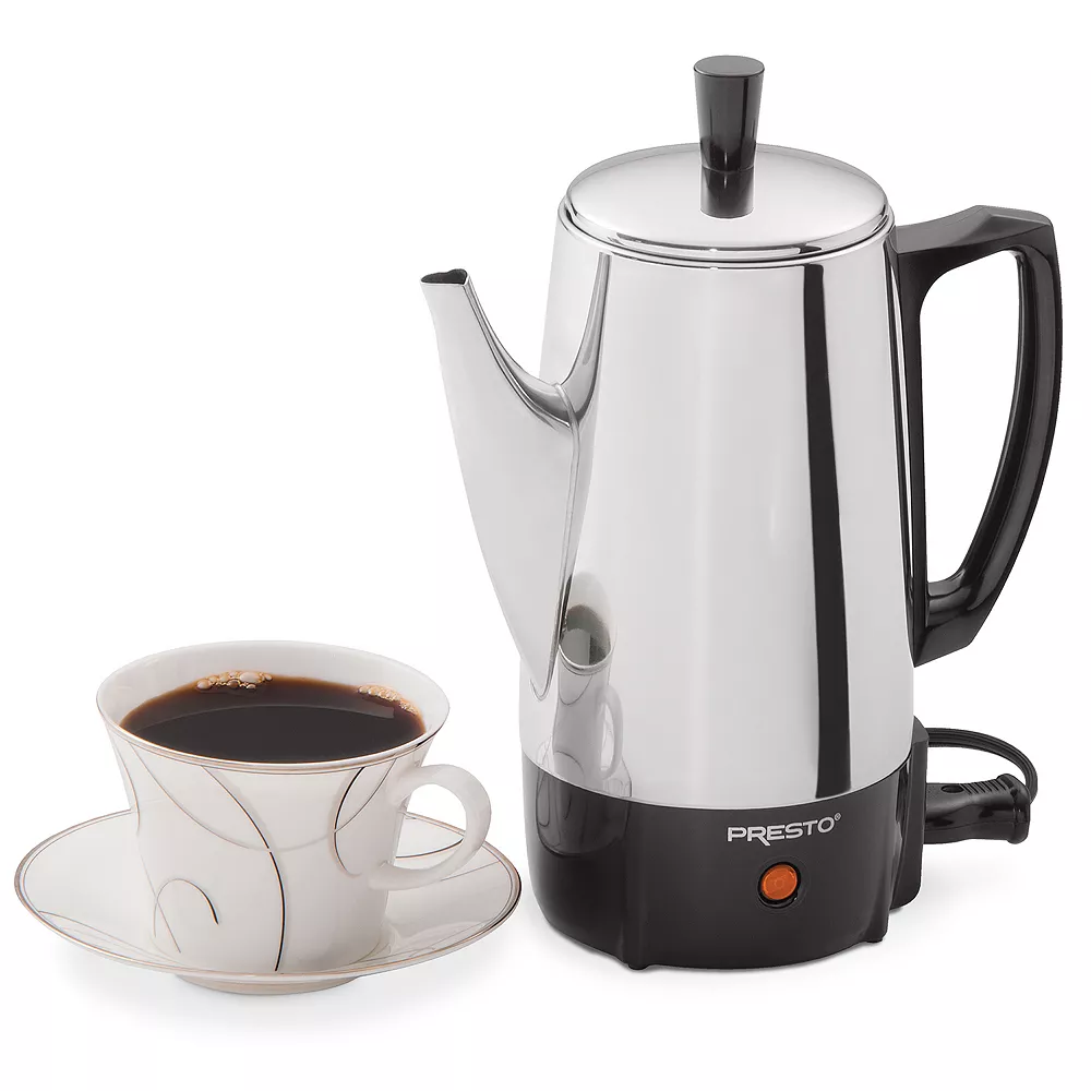 This Presto percolator brews great coffee, hot and rich! It makes 2 to 6 cups of great-tasting coffee as fast as a cup a minute, then keeps it piping hot automatically so you’ll always be ready for guests.
