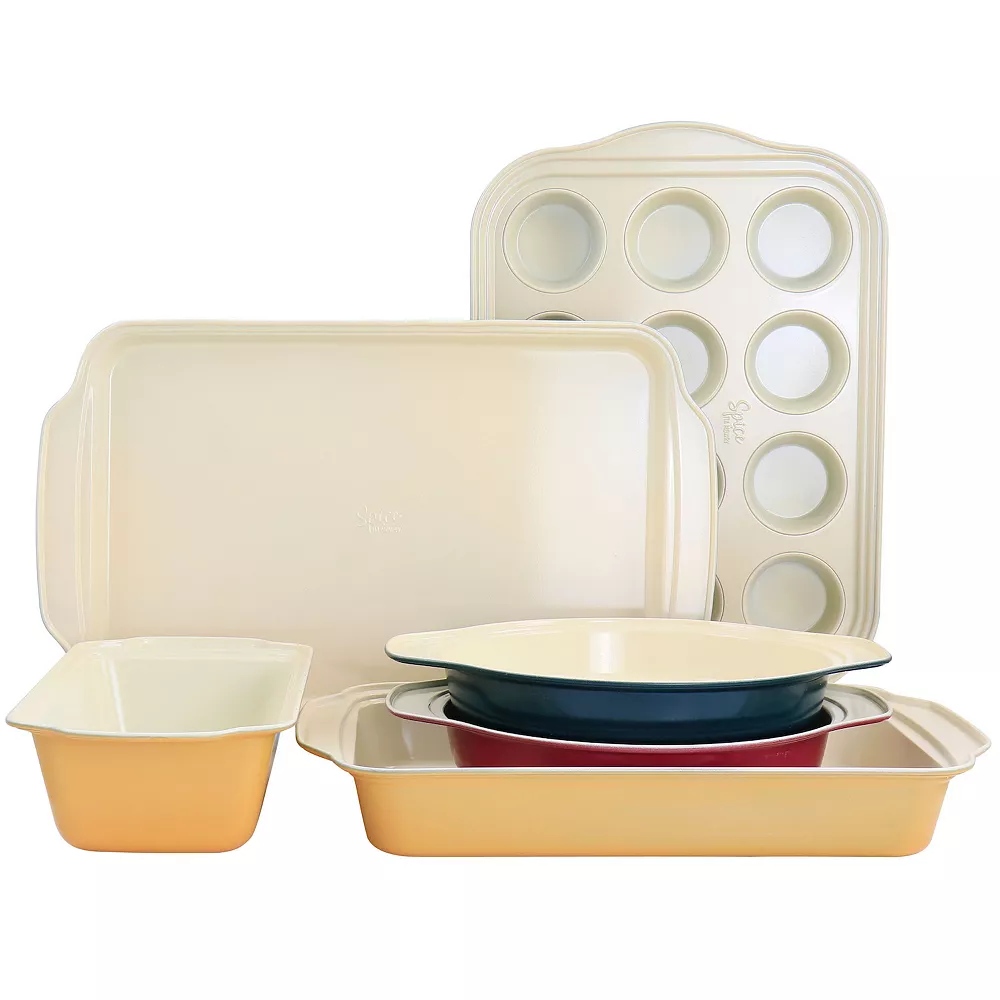 Up your oven-to-table game with the Spice by Tia Mowry Savory Saffron 6 piece bakeware set. These colorful and essential baking pans are a great way to serve up all of your faves, sweet or savory. Constructed with carbon steel that offers superior durability and maximum heat distribution for consistency with every bake. Ceramic non stick coating promotes healthy baking by reducing the need for extra butter or oil for coating. Set comes with a cookie sheet, roasting pan, muffin pan, loaf pan, and two cake pans to complete all your kitchen bakeware needs!