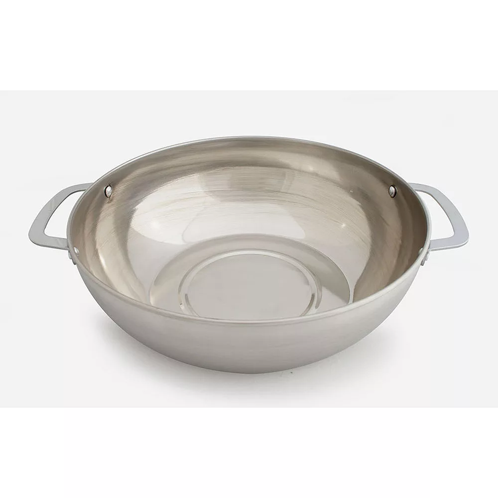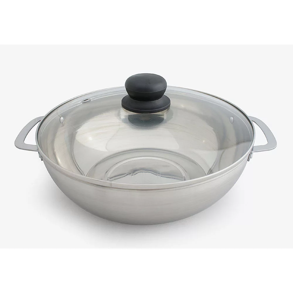 - Induction Ready and all heating surfaces. 0.5 mm stainless steel body. Dishwasher safe. Tempered glass lid. Flat bottom. Riveted handles