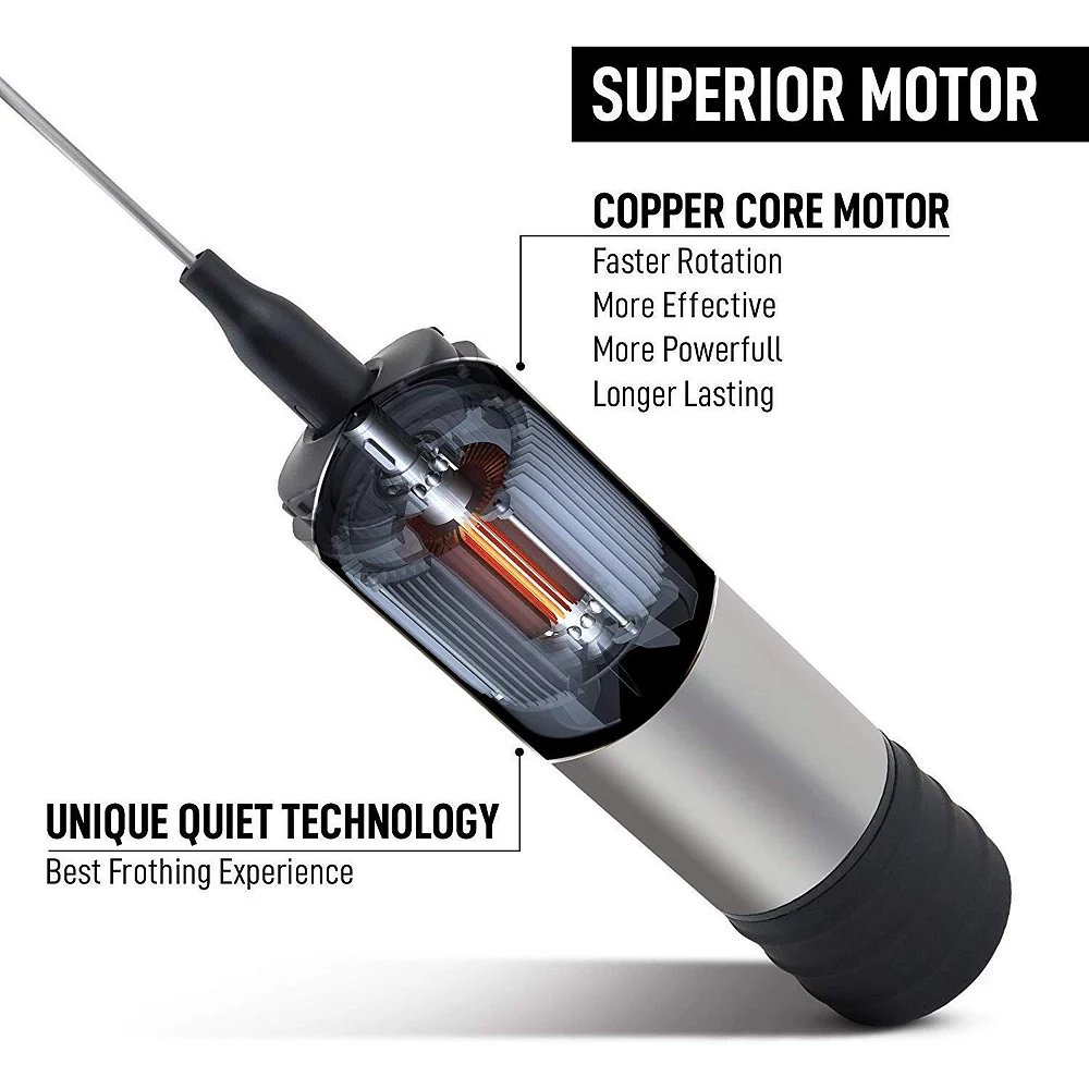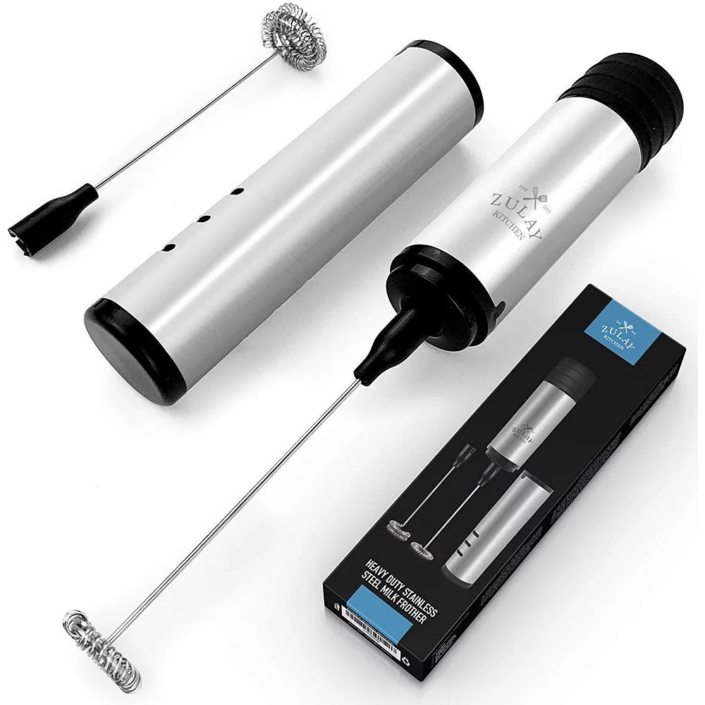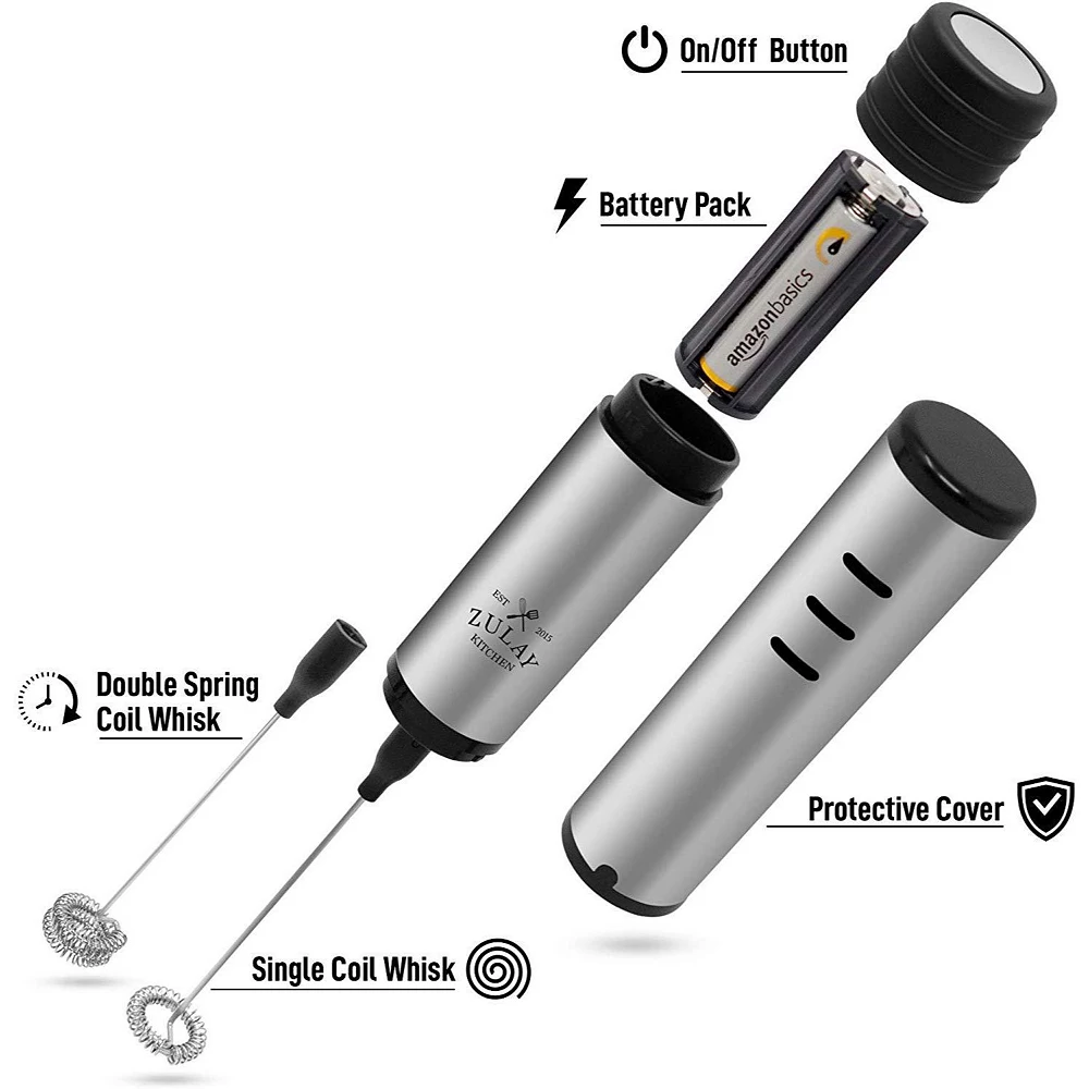 This heavy-duty and portable Milk Frother is ideal for use at home or on the go. The stainless steel case protects the whisks from damage and keeps them clean. Ideal for traveling, the unit is equipped with interchangeable single and double coil whisks, to help you blend and create different amounts of foam. The double coil whisk creates thicker foam with less air and is ideal for latte art, while the single-coil mixes quickly and creates lighter foam.