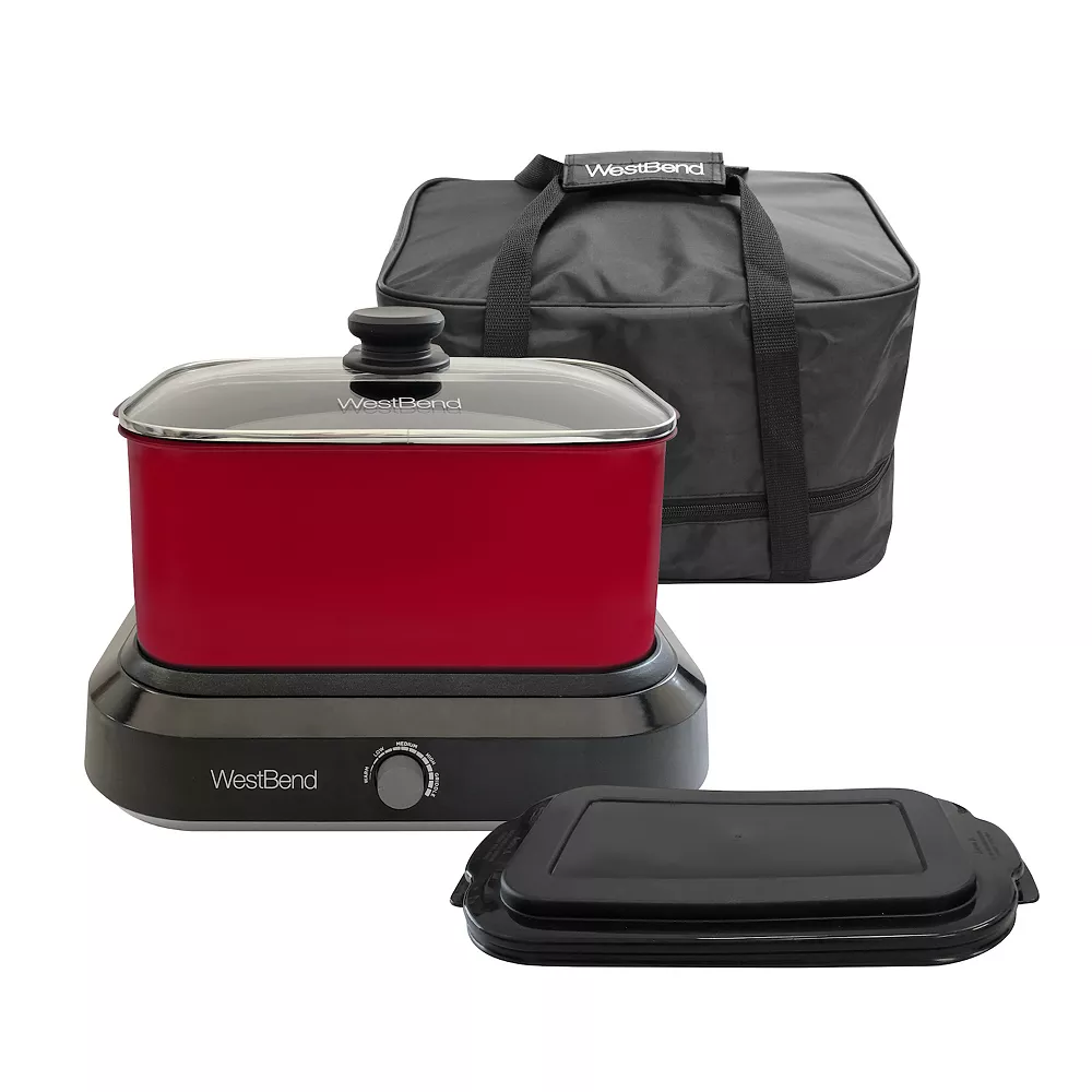 - Slow cooker heating base, aluminized steel cooking vessel, glass cover with knob, travel cover & insulated tote