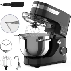 - MULTIPLE ATTACHMENTS: This mixer comes with a variety of accessories, including a whisk, dough hook, and Y-beater, to help mix with ease. It also comes with a splashguard to prevent flour from splashing and make pouring liquids smoother.